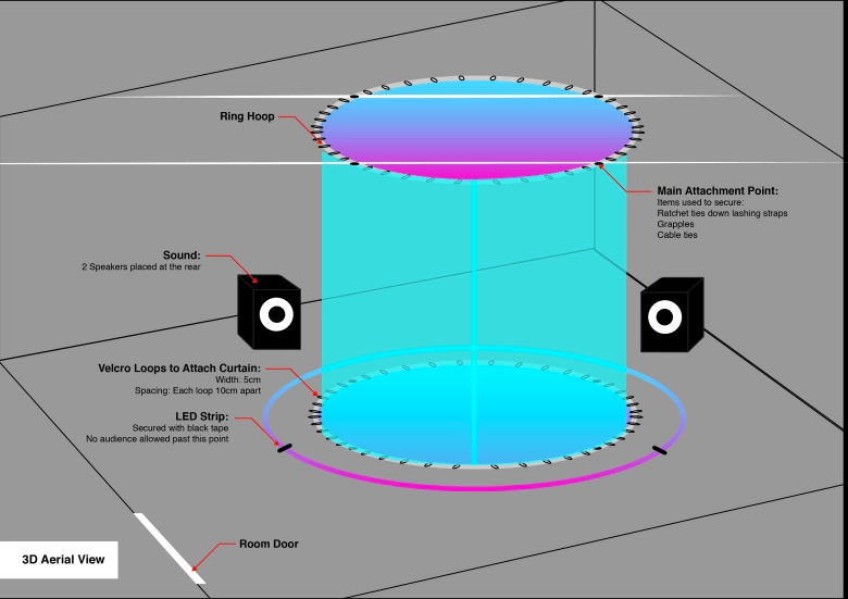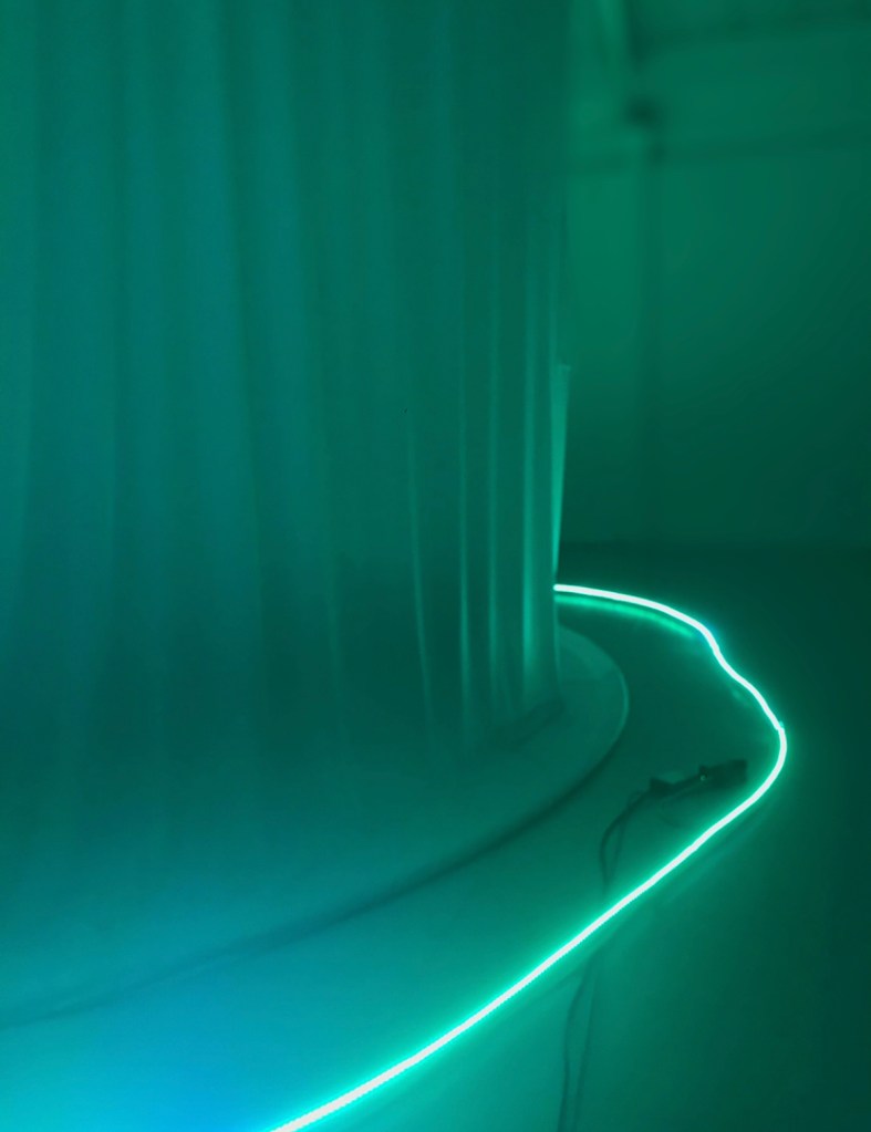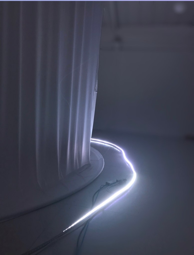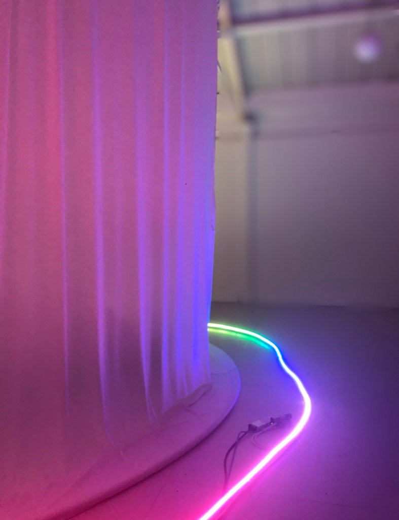 There was a set of 4m of technically advanced LED positioned on the floor externally to the installation in a circle. They directed light up and due to sheer intensit of light and colour were sufficient for flooding the entire space with colour. Ther were controlled through an application on a laptop positioned in the back right corner of the room (where the speaker is). The cables connecting LEDs to controller and laptop wew all tightly taped to the floor and out of reach of audience participants.